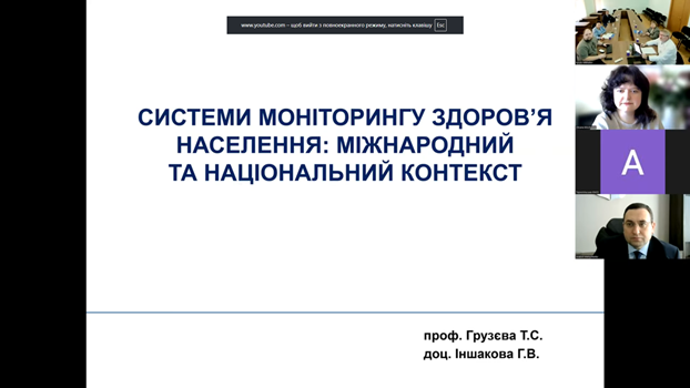 - Системи моніторингу здоров’я населення: міжнародний та національний контекст (д.м.н., проф. Грузєва Т.С., к.п.н., доц. Іншакова Г.В., Національний медичний університет ім. О.О. Богомольця);
